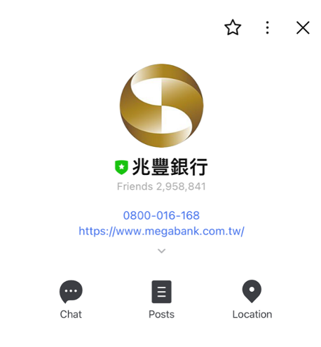 請認明官方認證的「綠色盾牌」才是正版的兆豐銀行LINE官方帳號,或搜尋ID : @megabank即可加入兆豐銀行LINE官方帳號的好友,並請於合法之應用程式商店下載本行認證APP。
